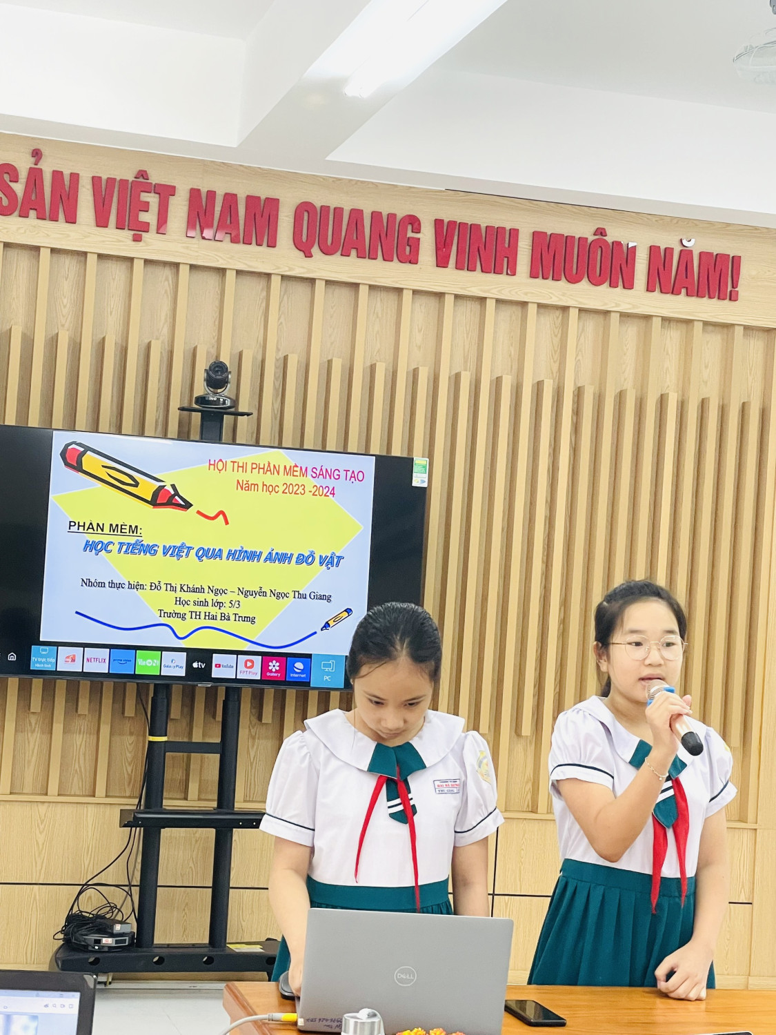 Tham gia cuộc thi lần này, có 18 sản phẩm phần mềm của 7 trường tiểu học trên địa bàn quận hướng đến tính năng hỗ trợ vui học tiếng Việt. Trường Tiểu học Hai Bà Trưng tham gia với 2 sản phẩm dựu thi: sản phẩm “Học Tiếng Việt qua hình ảnh đồ vật dành cho người nước ngoài” của nhóm học sinh Đỗ Thị Khánh Ngọc và em Nguyễn Ngọc Thu Giang – lớp 5/3 và sản phẩm “Bé học ca dao tục ngữ Việt Nam” của nhóm học sinh Đặng Nguyễn Gia Bảo và Trần Phước Trung- lớp 3/4. Ban giám khảo sẽ chấm chọn ra những sản phẩm tốt nhất để tiếp tục dự thi phần mềm sáng tạo cấp thành phố được diễn ra vào tháng 5/2024.